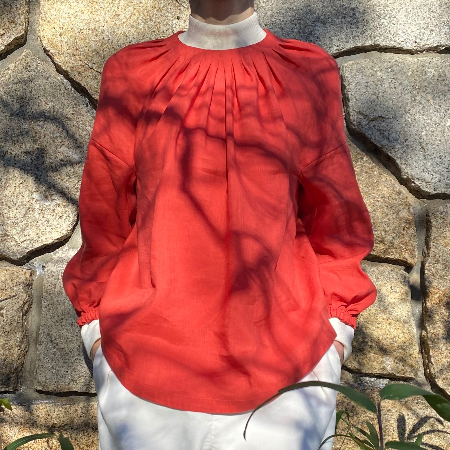 花が咲いていくような、ふんわりと広がるやさしいイメージを衿ぐりのタックとパフスリーブで表現しています。